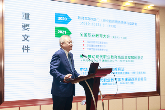 北京外国语大学教授、中国职业技术教育学会副会长孙善学以“当前职业教育主要形势与改革重点”为题作专题报告。他对当前职业教育政策进行深入透彻的讲解,围绕政治、经济、社会三个视角讲述中国职业教育的格局之变,深刻题剖析新时代职业教育发展路径及现状,并从体系、体制、内涵、技术、格局等五个方面指出当前职业教育的发展重点。整场报告高屋建瓴、内涵丰富,既有理论上的深刻感悟和独到见解,又有对职业教育实践的具体指导。