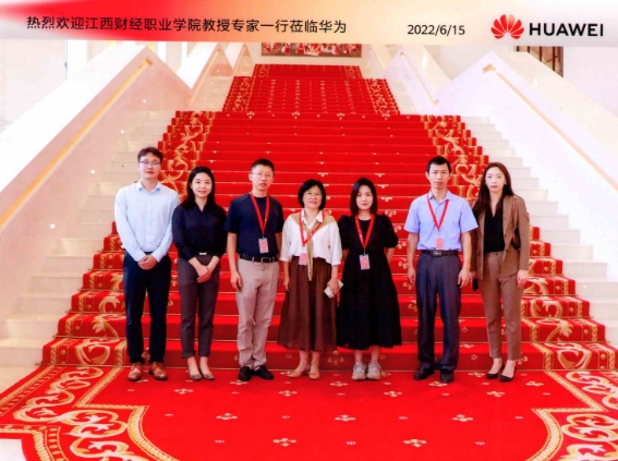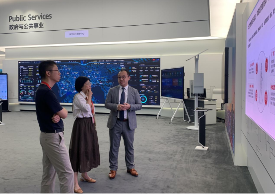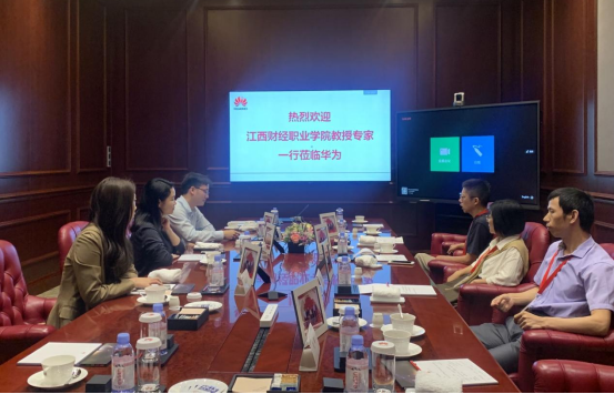 教师们在华为相关负责人的陪同下参观了华为的数字化转型展厅,观摩了华为在智慧城市、智慧金融、智慧电力、智慧政府与公共事业等领域的最新产品。校企双方就数字乡村实施落地等问题进行了深入的探讨。