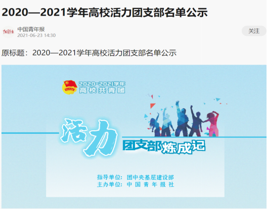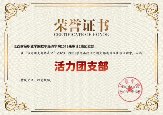 20217月,公司2019级审计2班团支部在“活力团支部炼成记”2020-2021学年高校活力团支部遴选及展示活动中,荣获“活力团支部”称号。