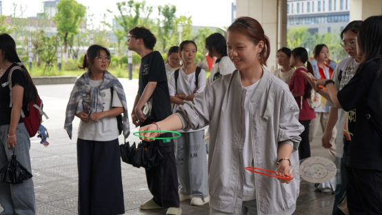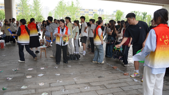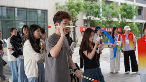 活动设置了多个游戏区域:“好运投壶”处,同学们手持“艾草箭”,在规定线外专注投掷,每一次投掷都饱含着经济对好运的期许;“射五毒”区域,大家手持玩具弓箭,眼神坚定地瞄准画有“五毒”的靶子,力求射中目标;“圈‘粽’你”摊位前,彩色套圈在空中划过,同学们希望套中辟邪粽子玩偶。每个游戏区域都围满了积极参与的同学,整个活动现场欢笑不断、气氛热烈。