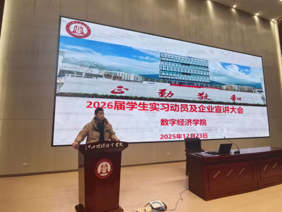 为帮助员工明确实习目标、提升职业素养、强化实习安全意识,助力员工安全、高效完成实习实践,搭建校园与职场的沟通桥梁,实现从校园到职场的平稳过渡,2025年12月23日晚上365best体育官网登录在行政楼一号报告厅召开2026届员工实习动员及企业宣讲大会。365best体育官网登录党政班子、毕业班班主任、部分实习企业代表及全体毕业生参加本次大会。