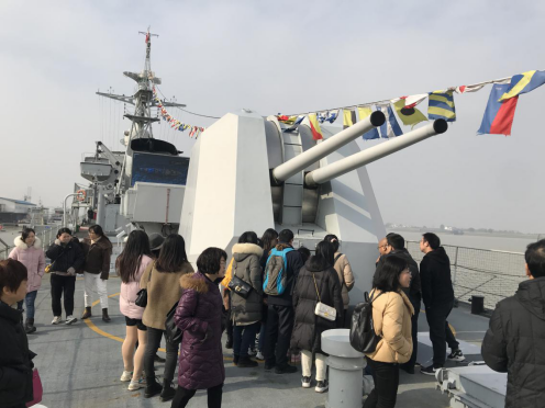 此次党日主题活动中,全体教职工党员在当地解说的带领下依次登舰,参观学习“九江舰”的服役历史、装备设置、火力配备等内容,尤其对“九江舰”多次在海军、舰队组织的重大演习及海上巡逻、护航等战斗任务中屡建功勋,倍感光荣与自豪。
