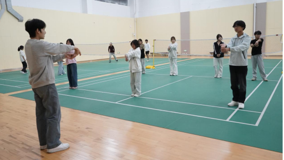 活动现场,蔡清首先带领同学们完成热身运动,随后开展专项教学。他围绕颠球、接球等基础技能进行示范讲解,针对员工动作中的不足逐一指导纠正,帮助大家掌握羽毛球运动的基本方法与技巧。学员们认真练习,积极参与互动,现场氛围有序且热烈。