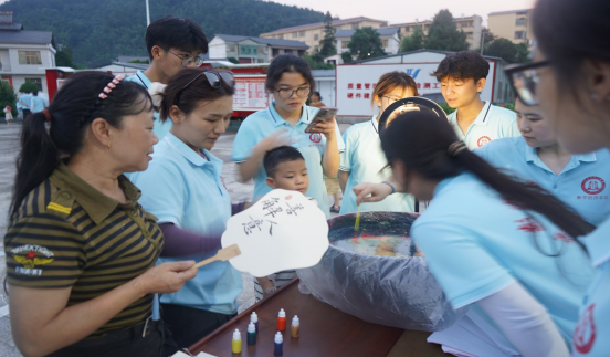活动现场,桌面整齐摆放着一张张洁白的扇子和五颜六色的漆料,队员们耐心地向村民们讲解漆扇绘制的技巧和方法,大家在志愿者的耐心指导下,亲手制作出了属于自己的漆扇。