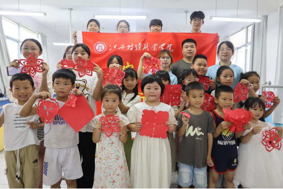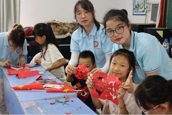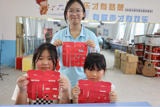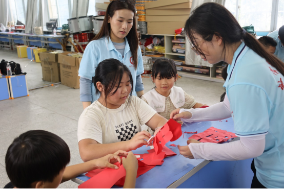 为了让小朋友们更好地理解和掌握剪纸技巧,实践队员们精心准备了丰富的教学材料和工具。从简单的对折剪纸开始,实践队员们耐心地示范每一个步骤,手把手地指导小朋友们如何折叠纸张、如何下剪。小朋友们全神贯注地倾听着,一双双小手紧紧地握着剪刀,小心翼翼地尝试着。