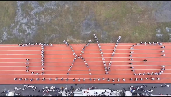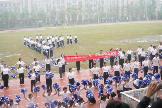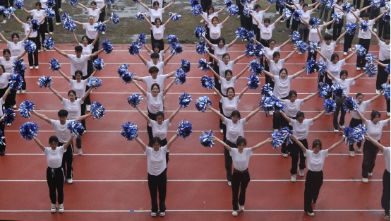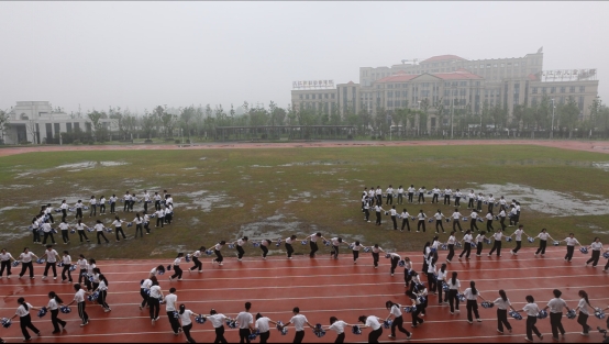 在我们操场中央,聚集着青春活力的舞者,他们身穿白衣,手拿彩球为我们带来精彩的表演——《乘风破浪》。