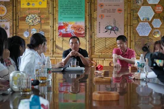 “我乡养蜂历史悠久,可以说家家养蜂、户户产蜜,一年四季百花盛开、蜜质上乘,特别是我乡的冬桂蜜乃是可遇不可求的蜜中之王。复原蜂蜜是我们的传统产业,自合作社2022年成立以来,产量已达到15000斤,较上年翻了一倍。”复原乡村长介绍道。复原蜂蜜发展的最大阻碍就是交通不便、销售不畅,“酒香就怕巷子深”。为此,实践队员调整“三下乡”活动计划,结合专业知识,为复原乡定制专场直播,给村干部开展运营课堂。随后,村干部带领实践队一行人员参观复原乡思雅蜂文化农旅产业园。